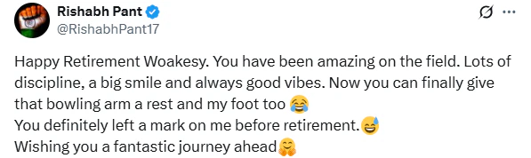 Pant, known for his light-hearted personality on and off the field, took to social media to send a cheeky retirement message. Referring to a memorable incident during the Manchester Test when a Woakes delivery fractured his foot, Pant wrote a cheeky message.